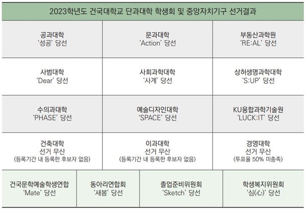 선거 결과 △공과대학 ‘성공’(92.79%) △문과대학 ‘Action’(94.2%) △부동산과학원 ‘RE:AL’(91.67%) △사범대학 ‘Dear’(92.68%) △사회과학대학 ‘사계’(92.41%) △상허생명과학대학 ‘S:UP’(93.5%) △수의과대학 ‘PHASE’(98.33%) △예술디자인대학 ‘SPACE’(99.85%) △KU융합과학기술원 ‘LUCK:IT’(93.09%)이 당선됐다.